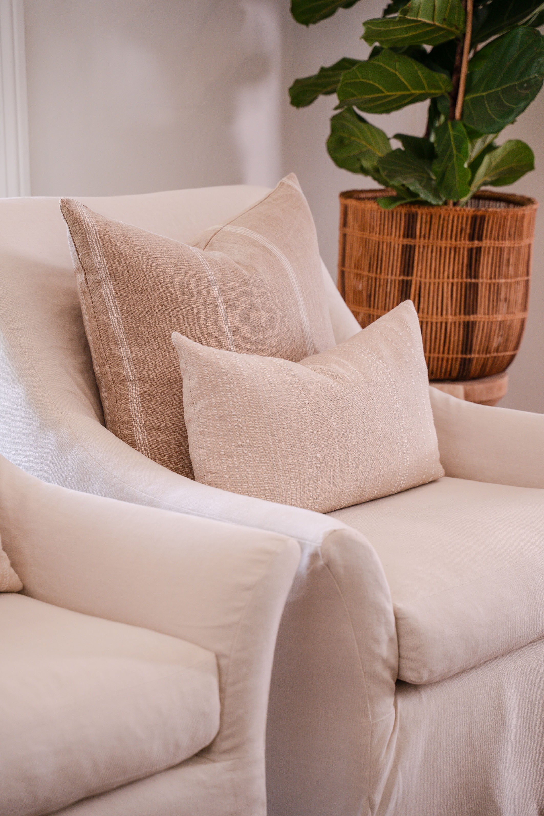 Two Juana Armchairs & ScattersThese elegant armchairs were designed to be compact with comfort in mind. Made in South Africa. Fabric: cotton & linen blend. Size: 90cm x 85cm.