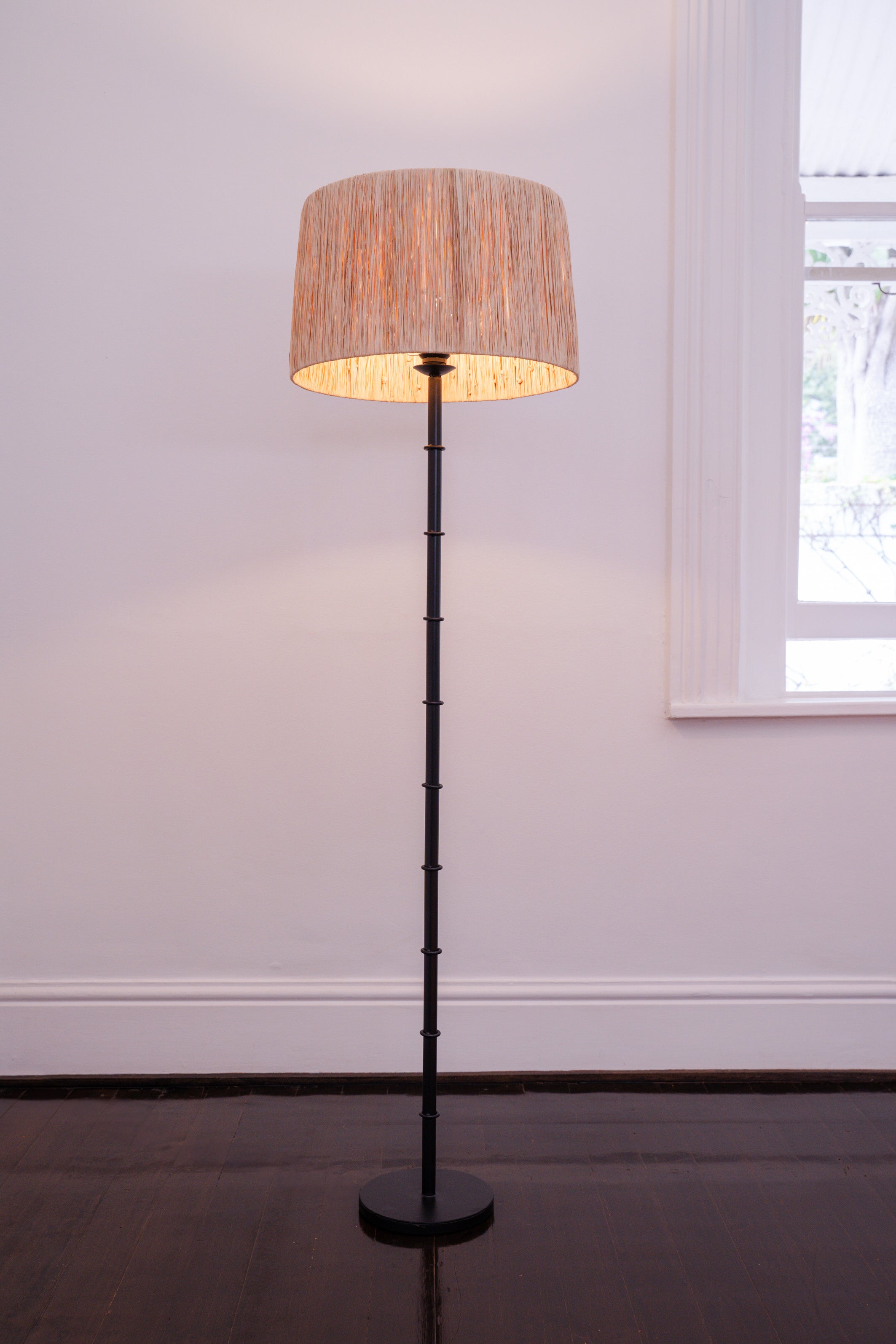 The Alfred LampFloor lamp with a metal base and ring detail. Shade: Raffia